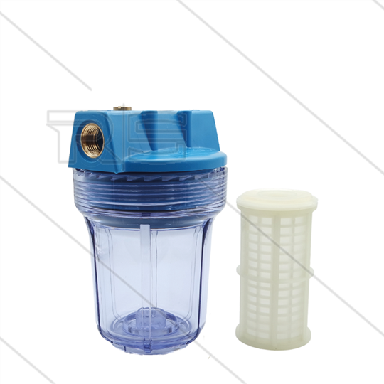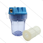 Patroonfilter 5" - 2x 1/2" bi - transparant glas - inclusief 60 mµ gaaspatroon - 13 l/min - H=176mm - max 8,6 Bar - max 40°C