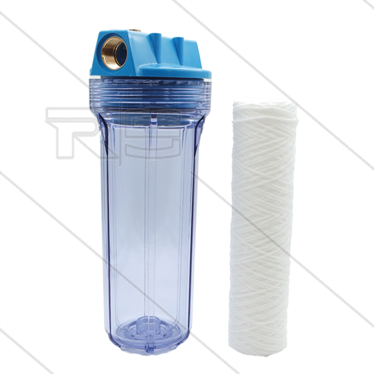 Patroonfilter 9" - 2x 3/4" bi - transparant glas - inclusief 20 mµ touwpatroon - 22 l/min - H=306mm - max 8,6 Bar - max 40°C