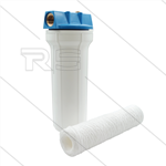 Patroonfilter 9" - 2x 3/4" bi - wit glas - inclusief 20 mµ touwpatroon - 27 l/min - H=306mm - max 8,6 Bar - max 40°C